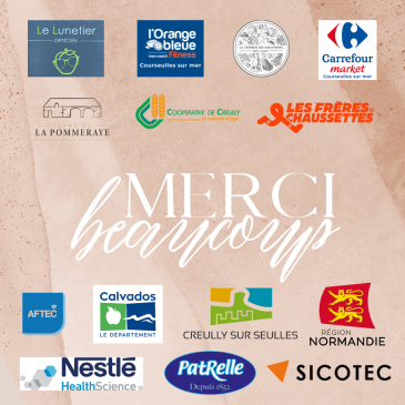 Merci à Amelie Carre du Lunetier Opticien, à L’Orange Bleue Courseulles-sur-Mer, à La Crémerie des Baratineurs, à Carrefour Market Courseulles Sur Mer, à la ferme de la Pommeraye, à la Coopérative de Creully, à la boulangerie de Esquay, à Les Frères Chaussettes, à Sicotec, à Patrelle Confiserie, à Nestlé Health Science Creully, à l’AFTEC Caen ainsi qu’à tous les partenaires institutionnels : Département du Calvados, Région Normandie et bien évidemment à Creully-Sur-Seulles.