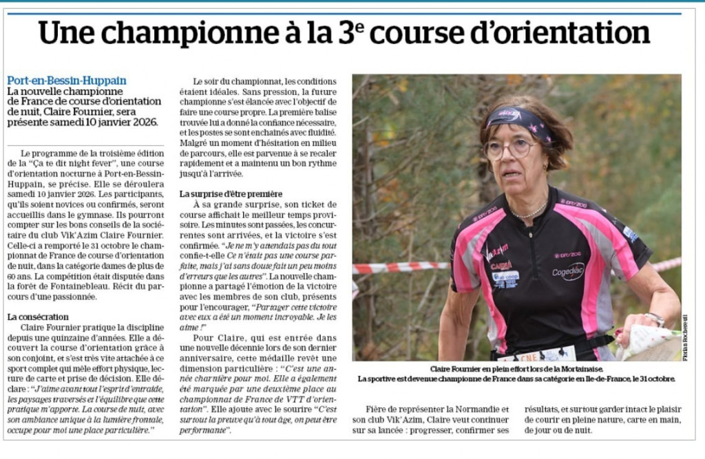 Figure emblématique du club, Claire entre dans l’histoire : à 60 ans, elle s’impose lors du championnat de France de nuit disputé fin octobre en forêt de Fontainebleau. Ce succès illustre tout autant son talent que sa remarquable longévité dans une discipline aussi exigeante que la course d’orientation.