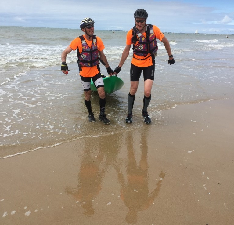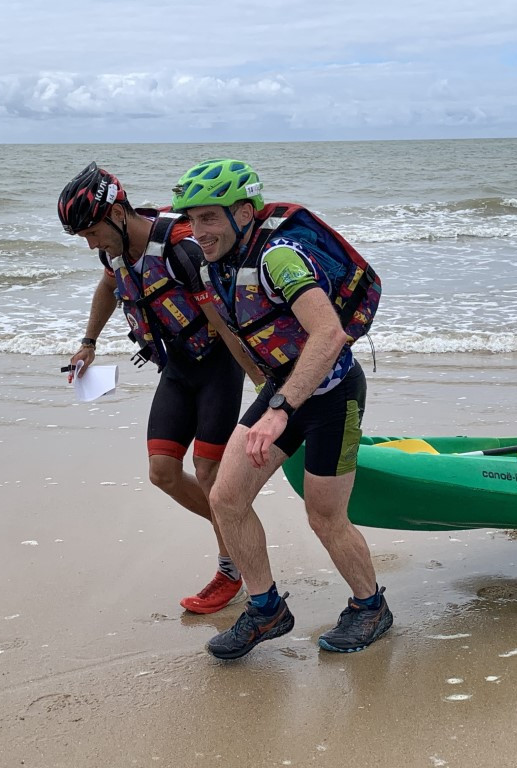 Pour quitter l’île et rejoindre la terre, c’est une section inédite et qui restera inoubliable qui nous attend : le kayak de mer. Nous voilà parti pour affronter les vagues pendant 1h30, ça remue, il faut lutter contre la houle et la dérive vers le large, on ne s’économise pas, mais on aime. A mi-parcours, on doit sortir du bateau et le tirer pour traverser une plage et pointer une balise. Je suis pris d’une crampe, ça passe, mais au moment de réembarquer, on se rend compte qu’il nous manque une pagaie !!! Me voilà bon pour un aller-retour sur la plage au petit trot pour la récupérer là où nous avions échoué.