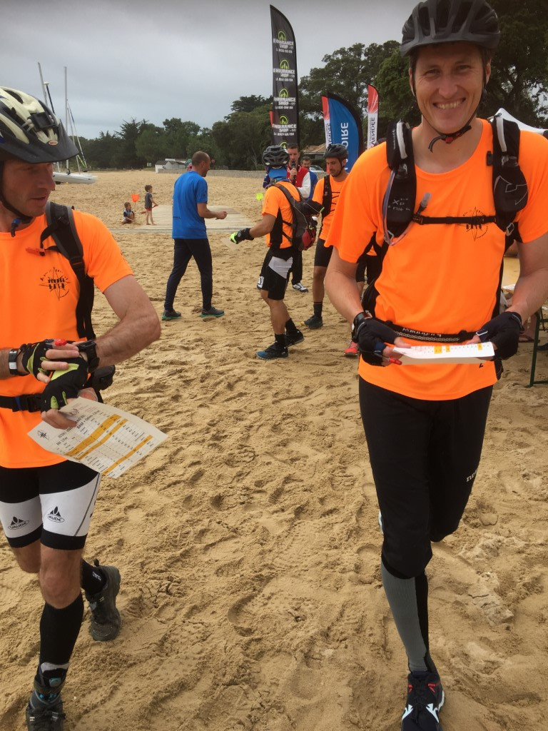 Les paysages sont magnifiques. Après le trail, on évolue à VTT’O au milieu des marais salants, puis en CO en forêt, avant de retrouver les plages pour un « trail mémo ». On fait le choix d’aller au plus court sur le VTT’O et la CO pour rattraper le peloton et nous recaler sur les heures que l’on s’est fixées.